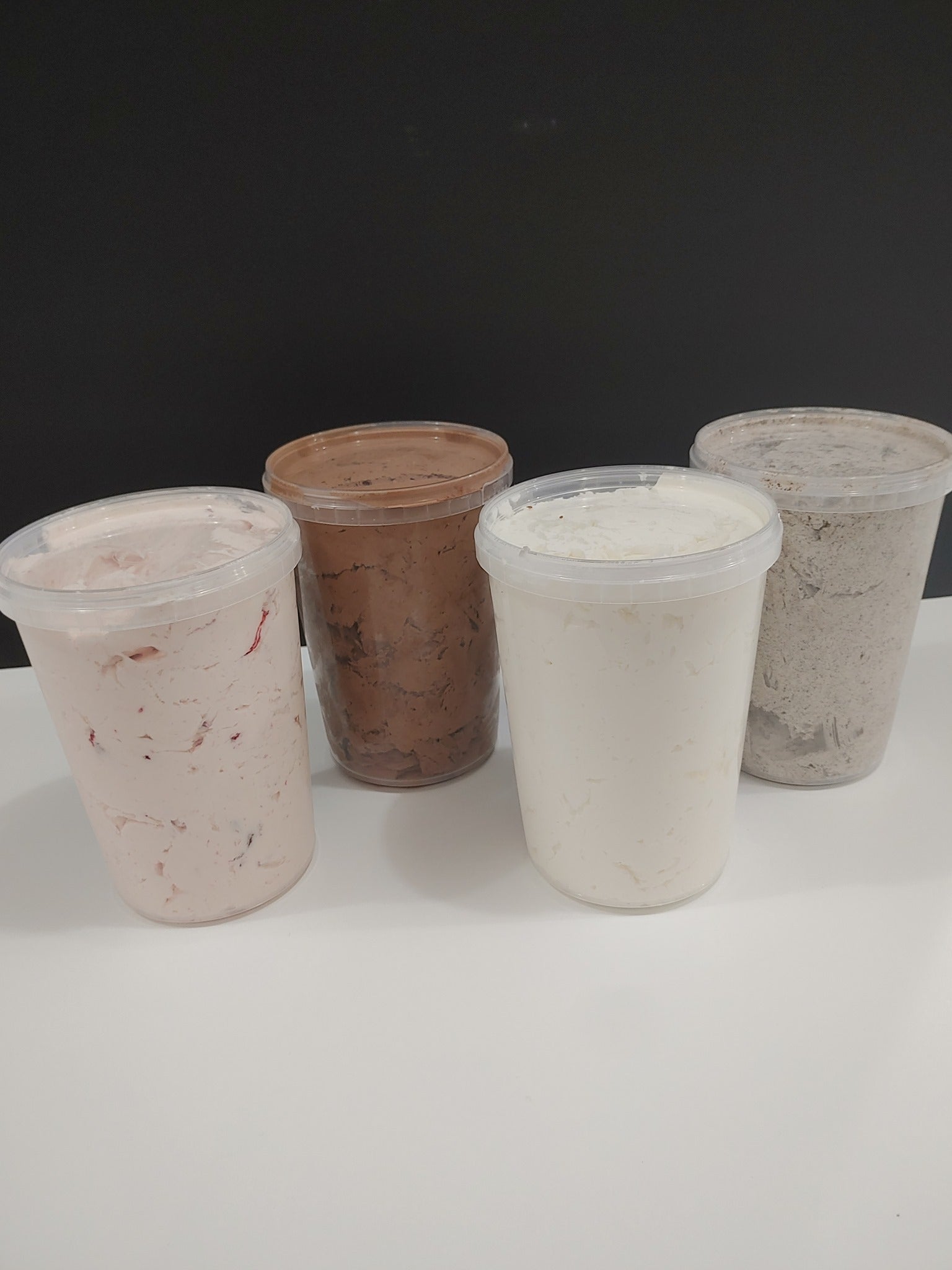 Vanille, chocolat, Oréo, caramel, érable, fraise, framboise, cerise, bleuet, barbe à papa, ananas, mangue, citron, lime, guimauve, gomme balloune, orange, noix de coco, pamplemousse, mûres & choco/menthe.