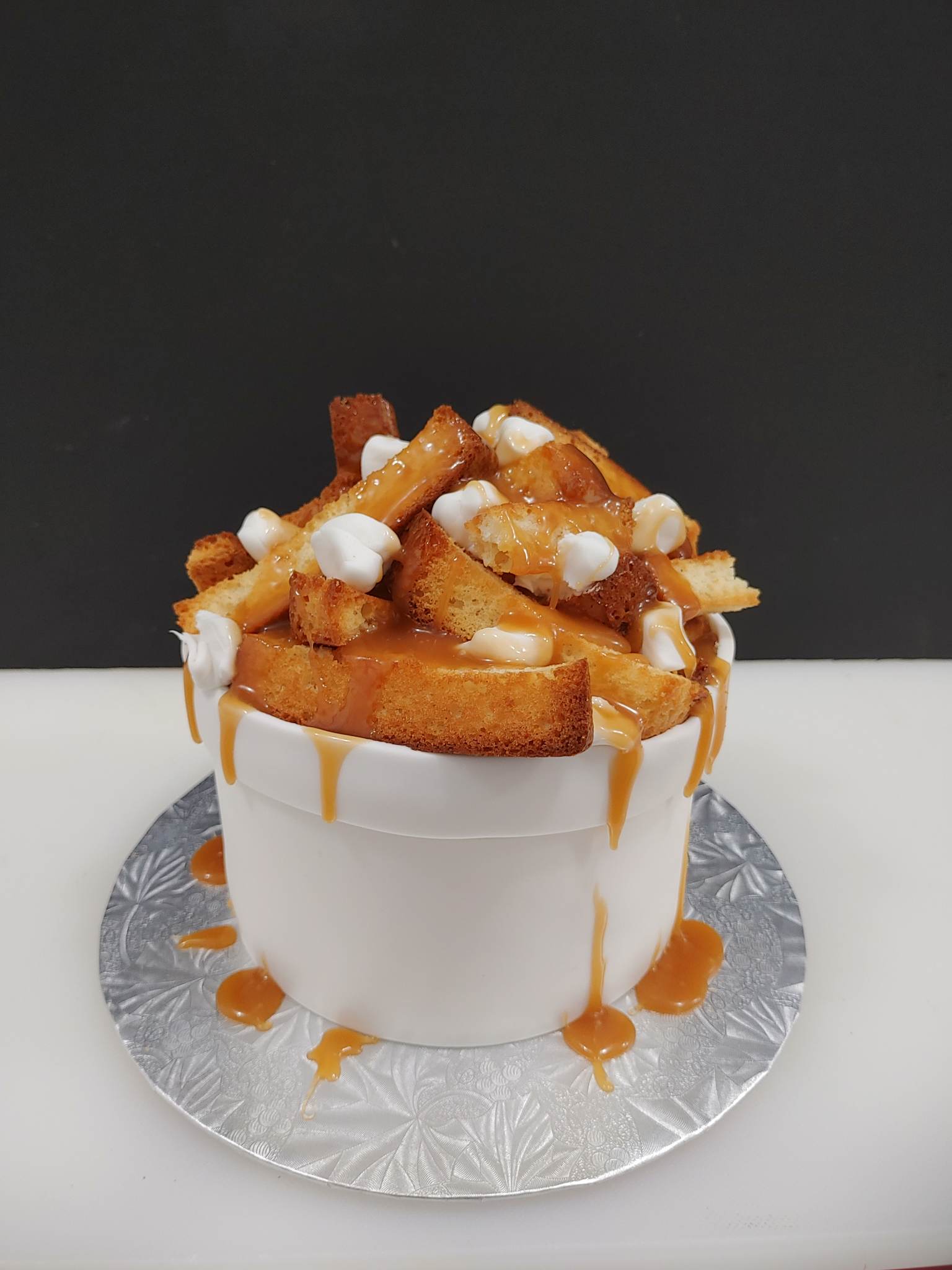 Un gâteau thématique Poutine avec des frites de gâteaux, une sauce de caramel et du fromage en fondant. Un effet bol en styromousse pour imiter un vrai bol fait avec du fondant.