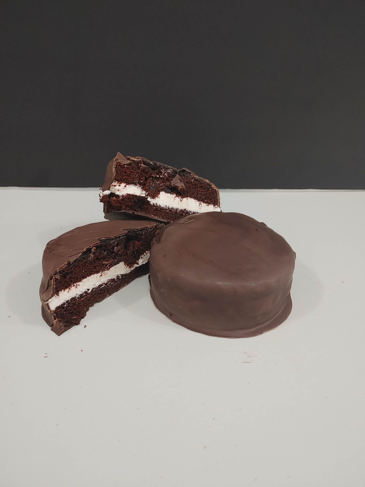 Œuf, sucre, vanille, farine de blé, sel, huile végétale, lait, eau, bicarbonate de sodium, levure chimique, cacao, beurre, shortening émulsifié, fondant mou, chocolat noir de couverture.
