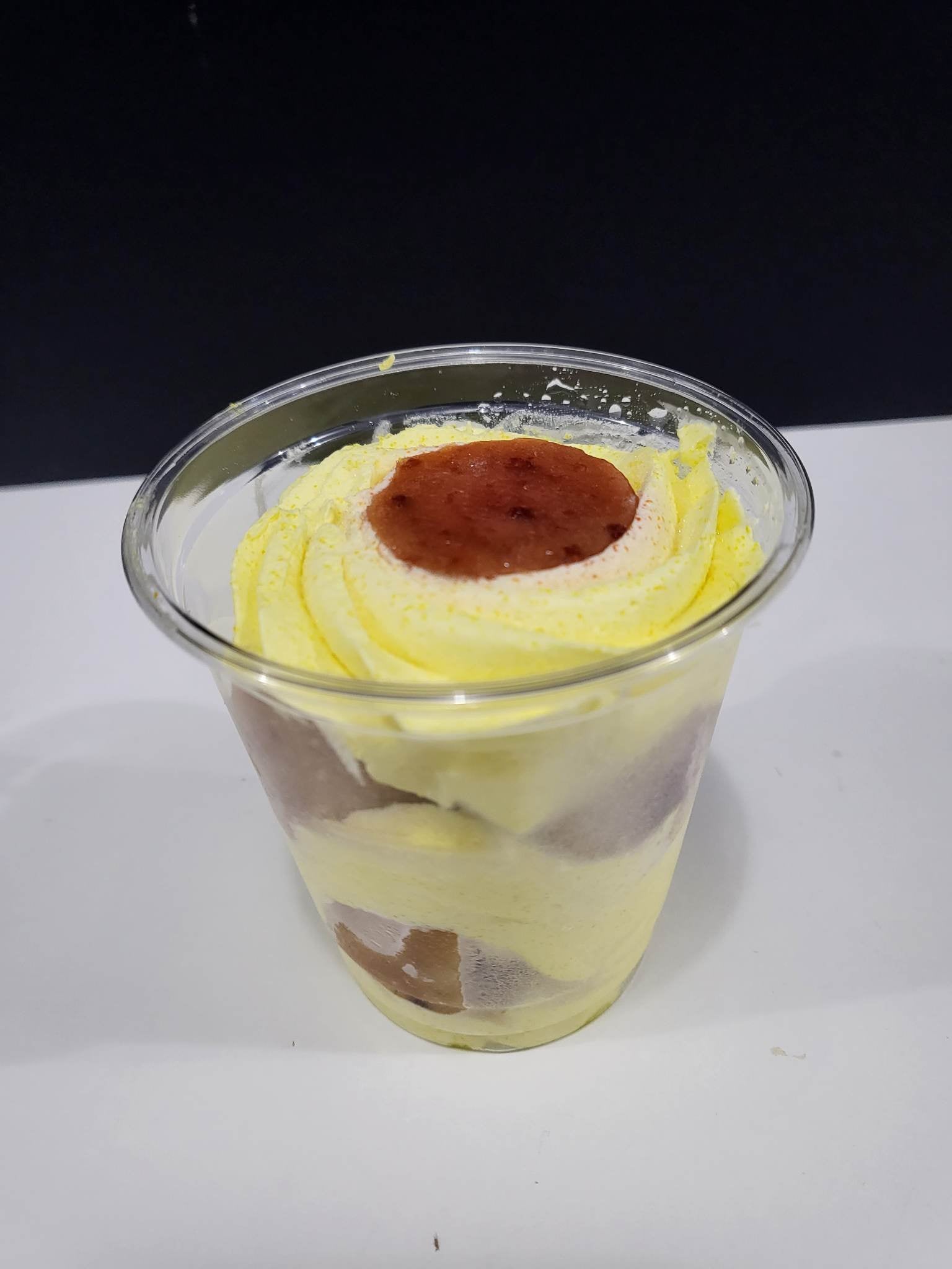 Oeuf, vanille, lait, eau, huile végétal, farine de blé, levure chimique, sel, sucre, essence artificielle et naturelle, colorant alimentaire, garniture selon la saveur, crème mona lisa, gélatine,